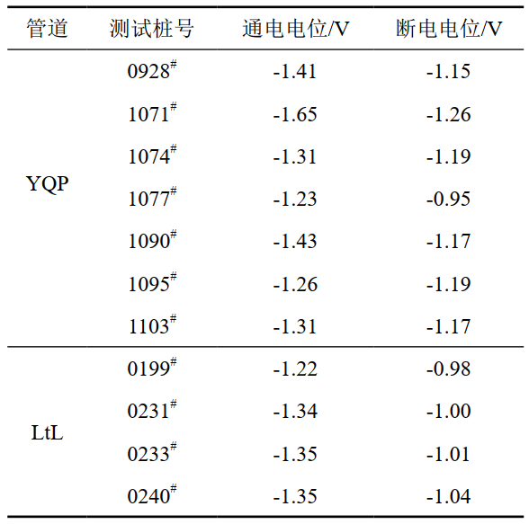 表 1 管道通電電位和斷電電位測試結果