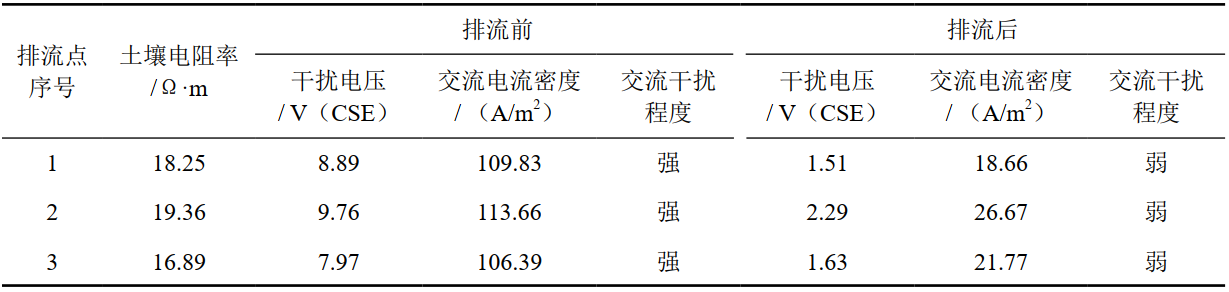 與高壓交流輸電線(xiàn)路并行敷設的管道,與110 kV及以上輸電線(xiàn)最外側邊導線(xiàn)間距小于300 m且累計長(cháng)度超過(guò)2 km的管段,應進(jìn)行交流感應電壓排流防護。平泰管道與220 kV上都高壓輸電線(xiàn)路并行且交叉,與最外側邊導線(xiàn)間距小于300 m范圍內管道長(cháng)度約2.3 km,故共設置3處排流點(diǎn),排流防護采用固態(tài)去耦合器和裸銅線(xiàn),裸銅線(xiàn)沿管道兩側敷設。排流防護結果如表 1所示。