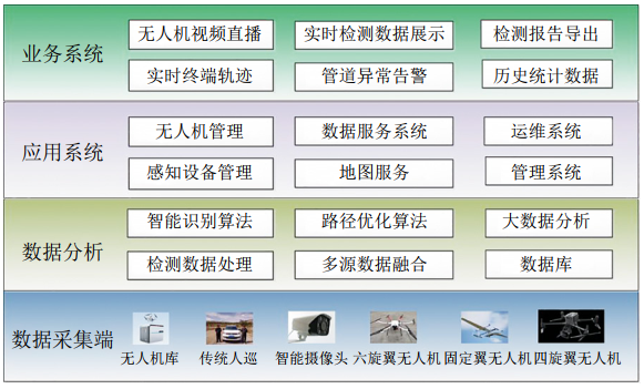 如圖 3所示,巡檢系統主要由數據采集端、數據分析層、應用系統、業(yè)務(wù)系統組成,可以遠程管控機庫進(jìn)行常態(tài)化管道巡檢和應急響應等場(chǎng)景應用。