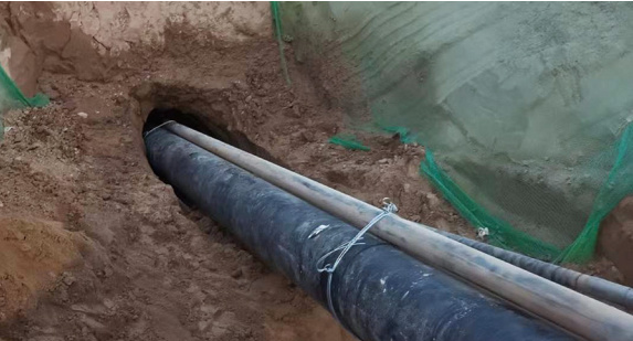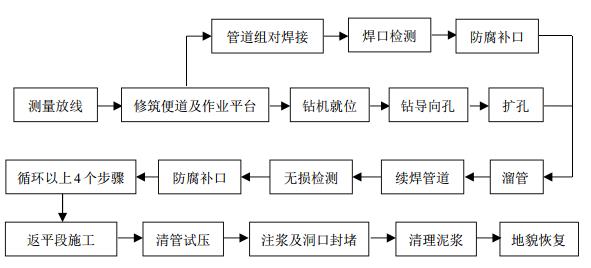 (7)返平段施工、清管試壓、注漿和洞口封堵、地貌恢復。進(jìn)行返平段施工;管道清管、試壓、干燥應符合有關(guān)標準規范;泵注漿液填充主管道與擴孔之間空隙;泥漿無(wú)害化處理,并恢復地貌。