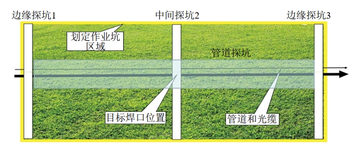 埋地油氣管道進(jìn)行維修作業(yè)時(shí)需要開(kāi)挖作業(yè)坑將管道露出,由于伴行光纜位置不明確,開(kāi)挖時(shí)存在損傷光纜的風(fēng)險。在某管道環(huán)焊縫排查中,通過(guò)采取“王字型”作業(yè)坑開(kāi)挖方式,有效保護了光纜的安全。