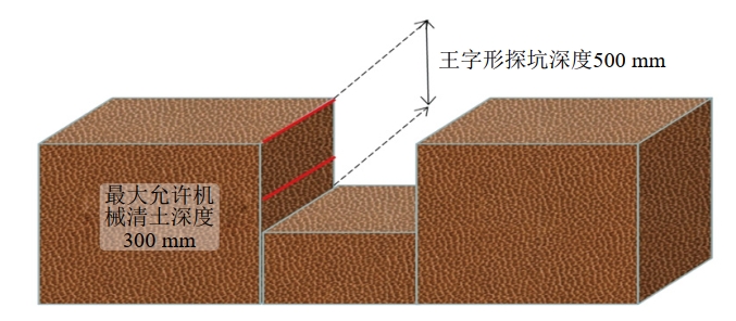 比較兩種開(kāi)挖方式,“王字型”開(kāi)挖在節省工作量的基礎上能夠提高探坑的有效性,增加了中間的一橫,使得探坑隱蔽工程檢出率增高!叭龣M”可以檢出光纜埋深變化,“一豎”則檢出垂直于管道的第三方電纜、供暖管線(xiàn)等隱蔽工程。
