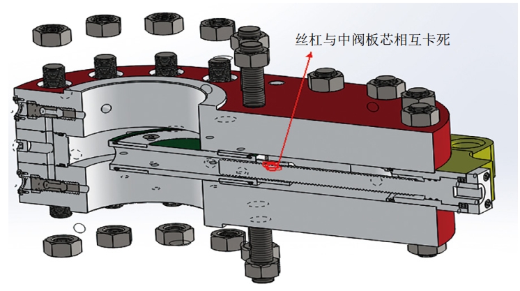 在力逐漸增加過(guò)程中產(chǎn)生了扭轉彈性應變,而未發(fā)生轉動(dòng),說(shuō)明絲杠與中閥板芯的螺紋相互卡死(圖 1)。