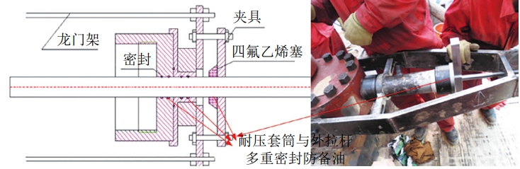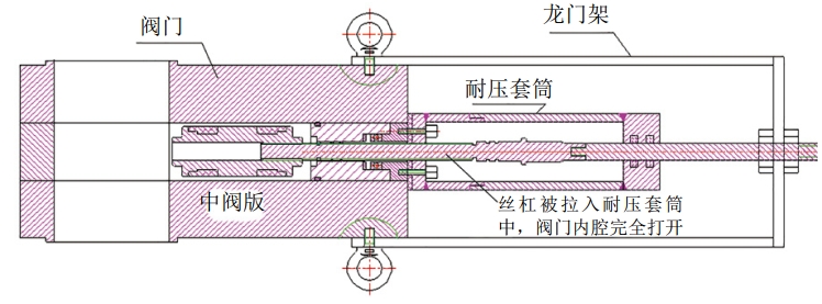 聯(lián)通耐壓套筒和管道,使兩者壓力平衡。觀(guān)察整個(gè)裝置的各個(gè)連接點(diǎn),用肥皂水檢查氣密性。確保無(wú)泄漏后,通過(guò)旋轉頂杠上部的螺母,緩慢將閥門(mén)絲杠拉出,從而打開(kāi)中閥板(在龍門(mén)架的外拉桿上做好中閥板抽出的起始標記,隨時(shí)時(shí)測量抽出的尺寸,直至達到最終值),如圖 3所示。