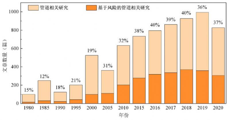 定期檢驗還可根據管道的損傷模式和風(fēng)險水平結合管道使用情況采用基于風(fēng)險的檢驗方法。近年來(lái),在行業(yè)專(zhuān)家及從業(yè)技術(shù)人員的不懈努力下,逐漸形成并完善了基于風(fēng)險的檢驗及完整性管理技術(shù)體系。如圖 1、圖 2所示,據全球文獻統計結果,自2010起,基于風(fēng)險的管道檢測研究占管道檢測研究總量的10%左右,且2018年占比高達19%;陲L(fēng)險的油氣管道相關(guān)研究占油氣管道相關(guān)研究總量的40%,標志著(zhù)基于風(fēng)險的管道檢驗與管道完整性管理理念的一致性已在全球行業(yè)范圍內達成共識,采用基于風(fēng)險的檢驗能更好地將檢驗工作與完整性管理相結合,是管道檢驗行業(yè)的一個(gè)發(fā)展趨勢[1]。我國新建及在役長(cháng)輸管道的基礎數據和運行管理數據齊全,經(jīng)過(guò)多次檢驗后獲取的檢驗數據完整,具備開(kāi)展基于風(fēng)險的檢驗條件。完整性管理是一種基于風(fēng)險的管理方式,本質(zhì)是通過(guò)風(fēng)險識別、檢驗和檢測、修復和風(fēng)險減緩等手段,將管道風(fēng)險控制在合理水平。在國家標準GB/T 37368―2019《埋地鋼質(zhì)管道檢驗導則》中也給出了基于風(fēng)險檢驗的流程和方法。