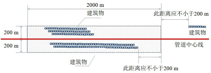 畫(huà)一個(gè)400 m×2000 m矩形框,在管道中心線(xiàn)沿軸向任意移動(dòng),矩形框的兩條400 m短邊距離框內外最近建筑物不應小于200 m,統計框內的住戶(hù)數量,兩端間管道則為高后果區,滿(mǎn)足規范規定的哪個(gè)條件就劃為哪個(gè)等級,簡(jiǎn)單易操作(圖 1)。