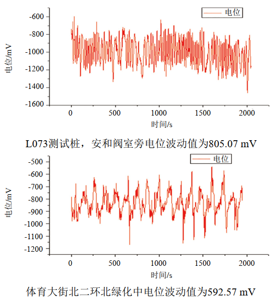 (3)雜散電流干擾檢測。地鐵開(kāi)通前檢測,2017年,鑒于當時(shí)石家莊市區地鐵2號線(xiàn)即將開(kāi)通,監管部門(mén)要求對市區地段管線(xiàn)進(jìn)行雜散電流干擾全面評估,必要時(shí)安裝排流裝置。根據GB 19285―2014《埋地鋼質(zhì)管道腐蝕防護工程檢驗》第4.3.4條,采用電位波動(dòng)法檢測9處雜散電流波動(dòng)情況,7處雜散電流干擾等級為強,部分結果如圖 1所示。