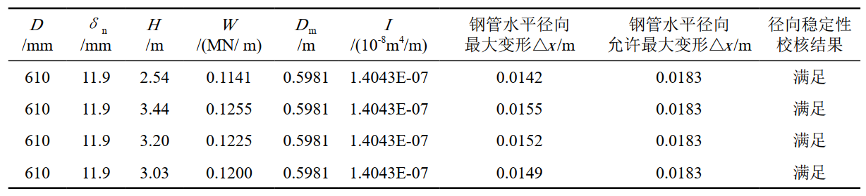 由計算結果可以得出,直埋于體育大街下的4處管頂埋深分別為2.54 m、3.44 m、3.20 m、3.03 m,體育大街公路通行車(chē)輛的單軸最大動(dòng)載荷為25 t(三軸),滿(mǎn)足徑向穩定性校核要求。