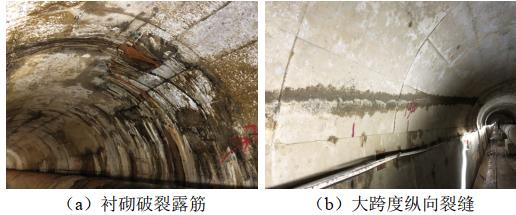 打開(kāi)隧道洞口,經(jīng)45天連續抽排水作業(yè),底板仍存在部分積水無(wú)法排盡,F場(chǎng)勘查發(fā)現,隧道底板被混凝土骨料大范圍覆蓋;襯砌多處裂縫,且有滲水、出砂、出泥以及泌鈣析出等現象,部分襯砌已破裂,出現露筋;襯砌拼接處,幾處排水口出水量較大,導致抽水進(jìn)度遲緩;南、北斜巷段的底板和支墩底部由于被水長(cháng)期沖蝕,部分區域已出現露筋,支墩底部不同程度被沖蝕;隧道拱頂存在多處修補區域,且其周?chē)殉霈F裂縫和滲水,如圖 1所示。
