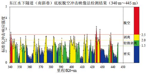 (2)隧道北岸斜巷段里程K1+520 m~ K1+790 m、南岸斜巷段里程K0+240 m~K0+445 m與平巷段里程K0+446 m~K1+521 m(南岸進(jìn)洞口起點(diǎn)里程為0+000)底板受水流影響區域,沖擊映像法檢測底板下病害(疏松、剝離、脫空)異常102處。其中K0+340 m~K0+445 m和K1+441 m~K1+521 m兩處,檢測結果顯示底板混凝土質(zhì)量均較差,前者大部分區域已剝離、部分區域出現脫空,后者底板整體出現疏松和脫空狀態(tài),缺陷斷面檢測結果分別如圖 3、圖 4所示。