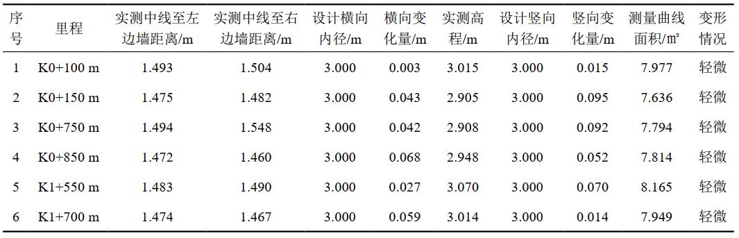(5)激光斷面檢測系統檢測37個(gè)凈空斷面,以工程設計斷面作為標準斷面,發(fā)現6個(gè)存在輕微變形,結果如表 1所示。