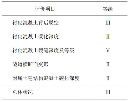 Q/GGWXQ 290―2021第9.1節將隧道結構按照完好(I)、良好(II)、合格(III)、不合格(IV)和危險(V)分為五級。I~III可常規保養或者小修,IV和V應進(jìn)一步評估后修復。根據本次檢測結果,東江水下隧道結構評價(jià)結果如表 3所示。最終隧道總體狀況評定為III級,判斷目前東江水下隧道為合格狀態(tài)。