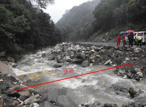2010年7月,受連續大暴雨影響,關(guān)山溝泥石流爆發(fā),管道沿線(xiàn)水毀災害十分嚴重,許多地段公路邊溝破壞、護岸擋墻垮塌、過(guò)水路面不復存在,有600米管段多處受損。其中A穿越河流處,原采用護岸墻+圓管涵水工保護工程防護,管堤受板橋溝洪水垂直沖刷嚴重,洪水中夾帶有大量塊石造成管堤處原有圓管涵堵塞,塊石直接沖擊管道上方已形成寬約10米、深約5米的豁口,6米長(cháng)露管,表面防腐層局部破損(圖 1)。