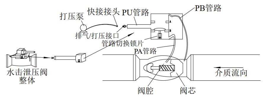 頂壓法工作原理如圖 1所示,配套研制了排氣和打壓一體裝置,包括缸體、管路組件、通流接口組件和管路切換組件。缸體內形成流路切換腔及分別與其連通的第一流道(PB管路與PU管路組成的流道)和第二流道(PA管路與PU管路組成的流道),排氣管路(PU管路)與第一流道連接,打壓管路(PA管路)與第二流道連接,管路切換鎖片可以選擇第一流道和第二流道之一與流路切換腔連通。同時(shí),通流接口組件可以控制流路切換腔與外部通斷,并用于與打壓泵連接。當水擊泄壓閥需要排氣時(shí),通流接口組件控制流路切換腔直接與外界大氣連通,再通過(guò)管路切換鎖片選擇第一流道與之連通,則來(lái)自水擊泄壓閥的上接泄壓管道的氣體可以依次流經(jīng)排氣管路、第一流道和流路切換腔,最后從通流接口組件排出。當水擊泄壓閥閥芯無(wú)法回位時(shí),可以將打壓泵與通流接口組件連接,控制流路切換腔與打壓泵連通,再通過(guò)管路切換鎖片選擇第二流道與流路切換腔連通,則打壓泵的液壓油或者潤滑油可以依次流經(jīng)通流接口組件、流路切換腔、第二流道和打壓管路,最后流入閥芯腔中,以推動(dòng)閥芯自動(dòng)回位。