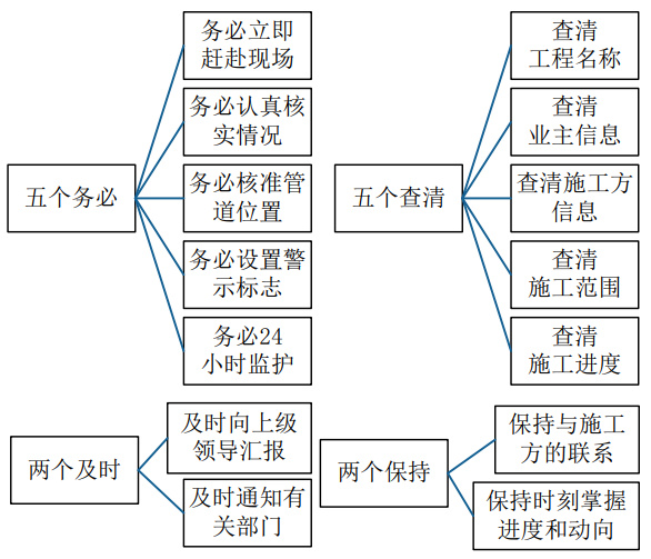 (2)監(監護管道)。堅持“重心靠前、溝通在先、預防為主”的12字方針,與管道周邊村委會(huì )建立良好的信息溝通機制,通過(guò)定期走村訪(fǎng)戶(hù),及時(shí)摸排掌握管道周邊的異常動(dòng)態(tài),提前介入、超前防范。對于第三方施工現場(chǎng)按照“五個(gè)務(wù)必、五個(gè)查清、兩個(gè)及時(shí)、兩個(gè)保持”要求(圖 1),嚴格執行“信息排查、安全警告、法制宣傳、信息溝通、簽訂協(xié)議、監護措施、監護預案、施工動(dòng)態(tài)” 等措施,堅持24小時(shí)蹲守監護,確保管道不受損害。