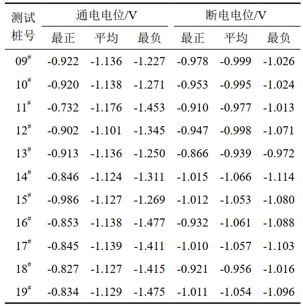 采用密間隔電位法采集管道沿線(xiàn)斷電電位(圖 2),參考測試樁處土壤電阻率,進(jìn)行陰極保護有效性評價(jià)。