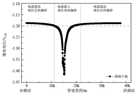 根據設計資料及相關(guān)標準,光伏電站正常運行情況下組件對地泄漏總電流設置為8.02 A。光伏發(fā)電板與赤洪支線(xiàn)最小間距為5 m?紤]最保守的評估條件,直流泄漏電流均從距離最近光伏板流入、流出大地,此時(shí)管道通電電位設置為﹣1.2 V。管道電位分布如圖 5所示,此時(shí)靠近該光伏板位置電流從大地流入管道,管道電位負向偏移;遠離該光伏板位置電流從管道流入大地,管道電位正向偏移,為陽(yáng)極干擾。通電電位﹣1.186 V~﹣1.413 V,最正偏移量為14 mV,最負偏移量為213 mV。參考現場(chǎng)監測數據(通電電位﹣0.732 V~﹣1.477 V,斷電電位﹣0.866 V~﹣1.114 V),判斷該直流干擾狀態(tài)下管道陰極保護電位均能滿(mǎn)足標準要求。