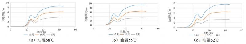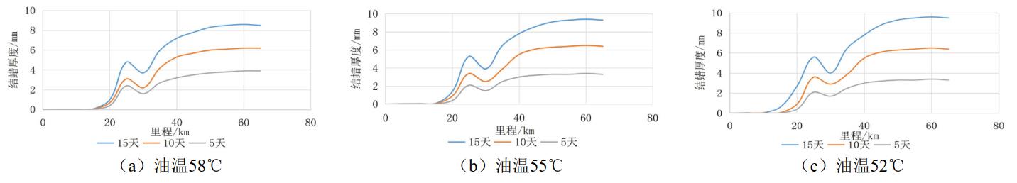 (1)不同出站油溫管道結蠟情況。分別選取高陽(yáng)站出站油溫58℃、55℃和52℃,管道沿線(xiàn)地溫10℃,輸量100 m3/h,結合該管段每10天進(jìn)行一次清管現狀,分別模擬計算管道運行5天、10天、15天的結蠟厚度。結果如圖 1所示。