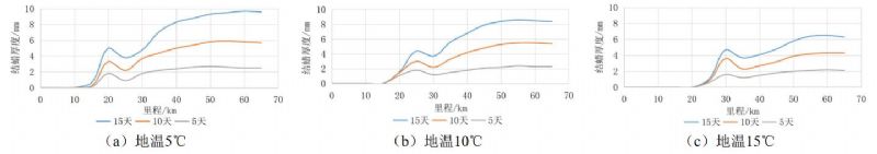 (2)不同沿線(xiàn)地溫管道結蠟情況。以高陽(yáng)站出站油溫55℃,輸量100 m3/h,分別選取冬季管道沿線(xiàn)地溫為5 ℃、10 ℃、15 ℃,模擬計算管道運行5天、10天、15天的結蠟厚度,結果如圖 2所示。