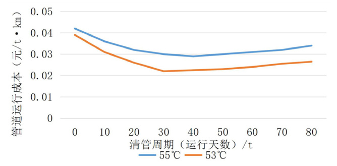 (2)實(shí)例計算表明,在考察的出站油溫和地溫條件下,油溫降低,清管周期縮短,管道運行成本先降低后升高。地溫越高,清管周期越長(cháng),管道運行成本越低。
