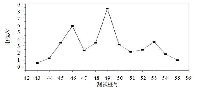 圖 1為管段大地電位梯度法測量結果,45#~53#測試樁大地電位梯度均大于2.5 mV/m,最高達到8 mV/m以上,近10 km范圍內大地中存在雜散電流。
