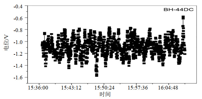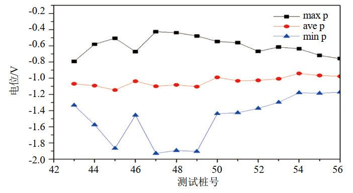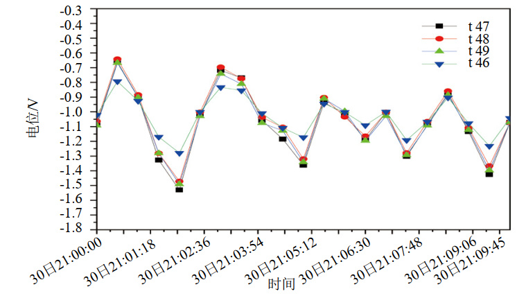 圖 2為45#測試樁30 min管地電位連續監測曲線(xiàn),管地電位波動(dòng)嚴重。其管地電位出現頻度正太分布如圖 3所示,符合直流動(dòng)態(tài)雜散電流干擾特征。圖 4為全管段測試樁連續監測的最大、最小及平均管地電位?梢钥闯,由于受到雜散電流干擾,管道最大電位已無(wú)法滿(mǎn)足陰極保護需求。為進(jìn)一步考察管段受到干擾的來(lái)源與規律,對各測試樁上的管地電位進(jìn)行了長(cháng)周期24 h同步測試,采用衛星授時(shí)。結果如圖 5所示。