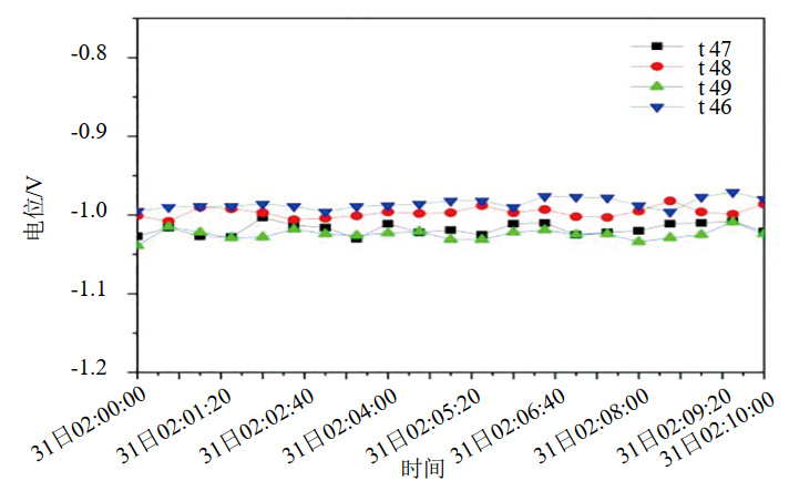 管道干擾電流靜默期內,管地電位幾乎沒(méi)有變化,說(shuō)明此時(shí)外界的干擾源不再釋放干擾電流,管道無(wú)干擾電流進(jìn)入或流出。干擾期內測試樁的管地電位正向負向同步變動(dòng),管地電位的偏移是干擾電流的流入或流出造成,因此說(shuō)明同一時(shí)間點(diǎn)管段電流流入或流出的方向相同。這種管地電位變化通常說(shuō)明外界雜散電流穿過(guò)管道流向遠方的回路,或者干擾源距離管道較遠,造成干擾區在空間尺寸上較大。這符合上海地鐵8號線(xiàn)和16號線(xiàn)的換流站雜散電流干擾的規律。 綜合檢測結果可以判斷,管段日間受到較強的直流雜散電流干擾,干擾源為上海地鐵8號線(xiàn)和16號線(xiàn)換流站,必須采取雜散電流干擾防護措施,防止管道發(fā)生電蝕事故。