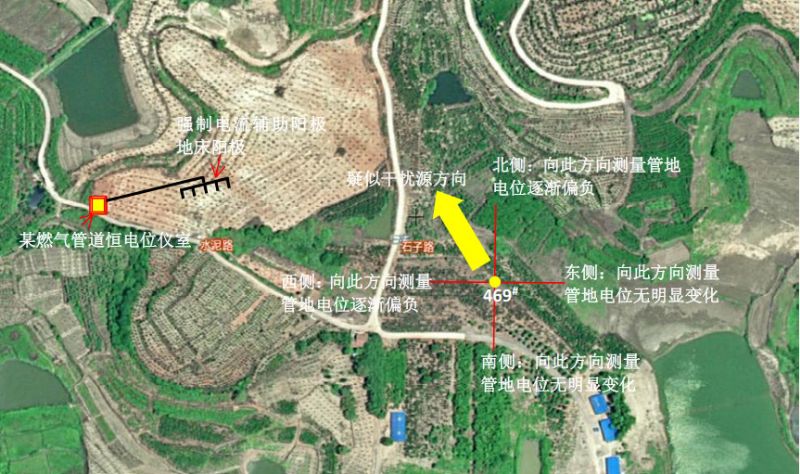 (3)確認干擾源。對西北方向丘陵西側進(jìn)行排查,在道路旁發(fā)現一處密封小房屋,經(jīng)墻上電話(huà)聯(lián)系確認為某燃氣管道強制電流陰極保護站,輔助陽(yáng)極地床位于該小房屋東南側農田中,與初步判斷的雜散電流干擾源方向相符。經(jīng)聯(lián)系該燃氣企業(yè)停用陰極保護恒電位儀后,測試469#管地電位恢復正常;啟用該恒電位儀后,重新處于干擾狀態(tài)。反復啟停恒電位儀測試確認,該處強制電流陰極保護系統陽(yáng)極地床為原油管道469#測試樁靜態(tài)直流雜散電流干擾源。如圖 2所示。