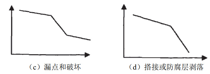 管道防腐層和土壤間存在電容耦合效應,同材質(zhì)完好防腐層自身具有穩定的電導率。正弦電流信號在管道和完好防腐層傳播過(guò)程中呈線(xiàn)性指數衰減,衰減曲線(xiàn)斜率取決于防腐層電阻率。電流信號以管線(xiàn)為中心發(fā)散同強度感應磁場(chǎng)。防腐層完好質(zhì)量均勻,電流衰減較小,相應感應磁場(chǎng)強度衰減較小。當防腐層某點(diǎn)有破損、搭接、剝落時(shí),電流信號從破損點(diǎn)流向土壤,電流急劇衰減,引發(fā)地面感應磁場(chǎng)強度也急劇衰減。沿管道方向越遠離電流信號源,電流信號衰減程度逐漸增大。防腐層正常、則電流信號均勻緩慢衰減(圖 1-a),防腐層整體質(zhì)量較差、則電流信號迅速均勻衰減(圖 1-b),如果防腐層出現漏點(diǎn)、則電流信號在漏點(diǎn)處前后出現階躍衰減(圖 1-c ),如果出現防腐層剝離或者搭接,則電流信號由均勻緩慢衰減轉變?yōu)檠杆倬鶆蛩p(圖 1-d)。相應的,通過(guò)檢測管道正上方磁場(chǎng)的衰減程度就可以判斷防腐層狀況,進(jìn)而對防腐層破損點(diǎn)進(jìn)行定位。