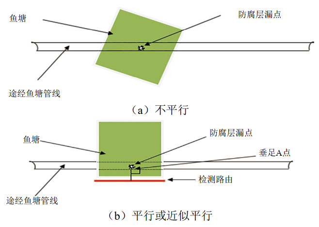 通常按照管線(xiàn)與水體邊緣是否平行進(jìn)行分類(lèi),以分別定位破損點(diǎn),如圖 5所示。該管線(xiàn)周邊90口水體邊緣與管線(xiàn)平行或近似平行,即圖 5(b)情況下,破損點(diǎn)兩端流向破損點(diǎn)電流信號衰減逐漸增強,手持接收機沿著(zhù)與管線(xiàn)平行的水體邊緣進(jìn)行檢測,顯示電流方向在某點(diǎn)轉向,記錄該點(diǎn)為A點(diǎn),經(jīng)A點(diǎn)到管線(xiàn)畫(huà)一條垂線(xiàn),垂足位置即為防腐層破損點(diǎn)。