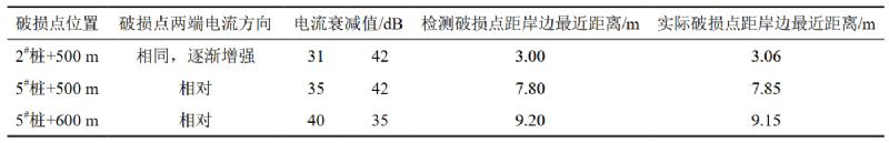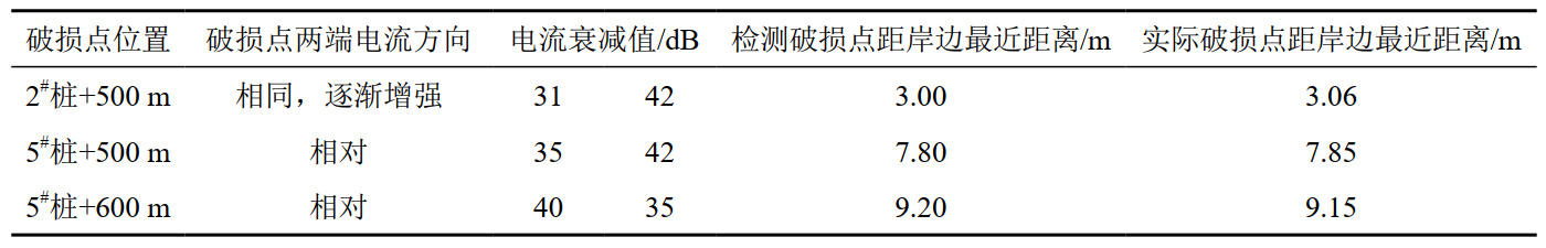 2017年12月,洪湖站采用RD-PCM對魚(yú)塘內管線(xiàn)抽樣檢測,發(fā)現2#樁+500 m、5#樁+500 m、5#樁+600 m三處分別存在45 dB、40 dB、40 dB以上漏點(diǎn),采用前述方法初步確定破損點(diǎn)為靠管線(xiàn)入口端水體邊緣3 m、7 m、9 m位置。開(kāi)挖顯示漏點(diǎn)位置和大小與檢測結果基本相符,如表 1所示。