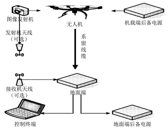 (2)長(cháng)時(shí)滯空視頻監控。普通旋翼無(wú)人機在空中停留時(shí)間過(guò)短,致使連通性、移動(dòng)性和大容量之間相互矛盾,系留多旋翼無(wú)人機小巧輕便,在100 m高度系留懸停時(shí)仍有10 kg以上的載荷搭載能力,并且采用地面電源持續供電工作,沒(méi)有續航時(shí)間限制,而且開(kāi)設迅速、無(wú)需空域申請、操作保障簡(jiǎn)單,是一個(gè)非常好的監控通訊平臺。有效地解決搶險救援中覆蓋、移動(dòng)和大容量之間的矛盾。其結構如圖 2所示。