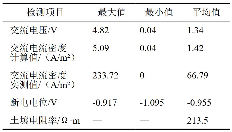 某管道敷設環(huán)境為沙土,防腐層為3PE形式,測試樁距離鐵路約1.5 km,附近無(wú)高壓輸電線(xiàn)路,無(wú)明顯可見(jiàn)干擾源。2022年,針對該管道一處測試樁開(kāi)展雜散電流檢測工作,采用數據記錄儀對測試樁處交流電壓、交流電流密度、斷電電位進(jìn)行24小時(shí)檢測,結果發(fā)現,現場(chǎng)實(shí)測的交流電流密度值與通過(guò)GB/T 50698―2011 《埋地鋼質(zhì)管道交流干擾防護技術(shù)標準》推薦公式得出的計算值存在較大差異,如表 1所示。
