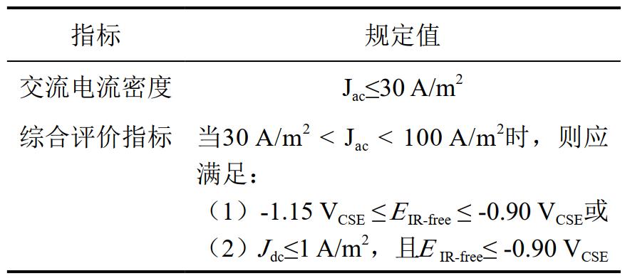 (2)SY/T 0087.6―2021《鋼質(zhì)管道及儲罐腐蝕評價(jià)標準 第6部分:埋地鋼制管道交流干擾腐蝕評價(jià)》標準中對交直流綜合指標進(jìn)行了規定,符合表 2中任一指標即可。在該評價(jià)指標中,所有值均為監測時(shí)段(一般為24小時(shí))內的平均值,標準中同樣未對動(dòng)態(tài)交流雜散電流干擾中可能會(huì )產(chǎn)生的偶發(fā)或頻發(fā)峰值進(jìn)行考慮。如表 2所示,采用另外一個(gè)數據記錄儀采集該測試樁處的斷電電位,最大值為﹣0.917 V,最小值為﹣1.095 V。應用此項評價(jià)指標進(jìn)行評價(jià),則此處無(wú)需采取排流措施。