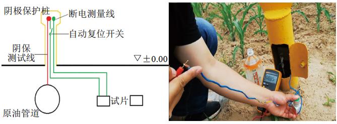 依據上述準則,公司在吳延線(xiàn)(甘泉至洛川段)安裝5組極化電位測量試片,用于檢測輸油管線(xiàn)的極化電位,以便判斷陰極保護電位是否介于﹣1.15 VCSE~﹣0.9 VCSE之間(圖 1)。