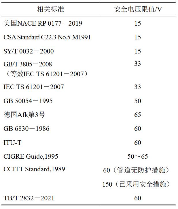 德國Afk第3號《對高壓交流設備和交流電鐵路設備和影響范圍內管道在敷設和運行方面應采取的措施》和德國鐵道、德國郵政和德國電站聯(lián)盟的設備間干擾問(wèn)題仲裁機構認為,在沒(méi)有防護措施的管道上,允許的短時(shí)感應最大電壓限值為1000 V;用瀝青作防腐層的管道為1500 V,小于該值時(shí)可不采取接地措施。