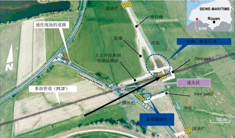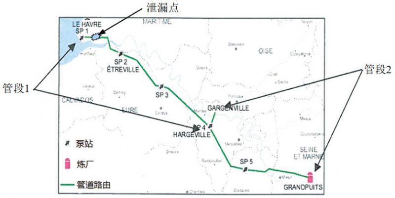 2014年5月,法國道達爾能源公司所轄的一條原油管道在巴黎霍德濕地(部分列入塞納河河口國家自然保護區)發(fā)生一起泄漏事故。估計泄漏量500 m³,造成了嚴重環(huán)境污染,未發(fā)生起火爆炸和人員傷亡,總經(jīng)濟損失約850萬(wàn)歐元,屬四級工業(yè)安全事故。事故管道建于1968年、全長(cháng)260 km、管徑508 mm、輸量102 000桶/天,始于法國大西洋沿岸的勒阿弗爾港口,向東南終于道達爾格蘭德普伊特煉油廠(chǎng)(圖 1)。