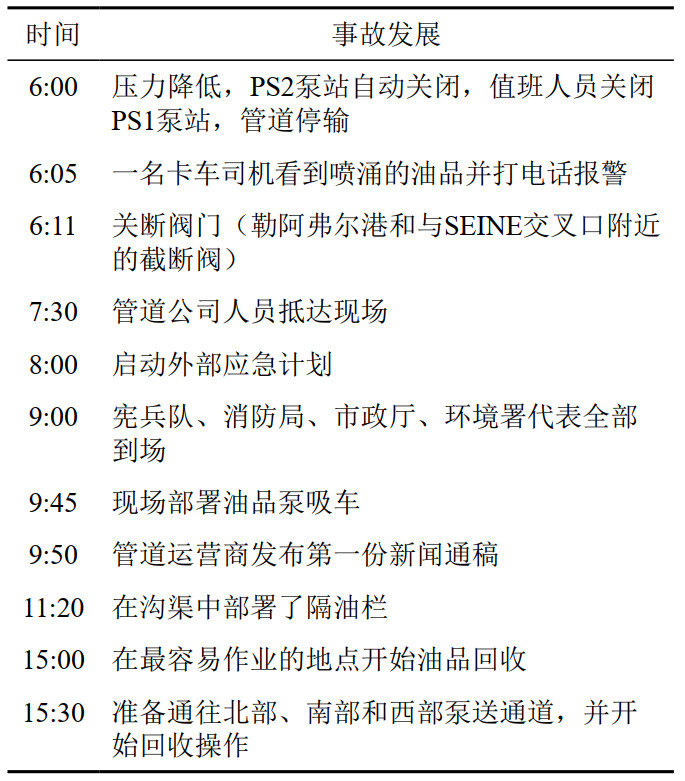 泄漏油品污染了周邊14 000m2(半徑約95 m)的草地,同時(shí)周邊48 000 m2(半徑約175 m)的植物附著(zhù)了油滴,油品順著(zhù)溝渠擴散820 m(當時(shí)溝渠已被淹沒(méi))進(jìn)入了附近的柳樹(shù)園。管道泄漏事故發(fā)展時(shí)間線(xiàn)如表 1所示,現場(chǎng)處置如圖 2所示。