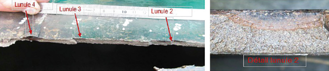 破裂區域內表面,發(fā)現與預先存在的縱向裂紋相對應的6個(gè)新月體,達到壁厚的35%~50%(圖 5)。其特征為高度氧化甚至腐蝕,與最終破裂區不匹配,表明它們的形成早于破裂。管道其余部分未見(jiàn)因腐蝕造成的壁厚損失。外表面輻射帶的存在表明裂紋從該表面開(kāi)始。