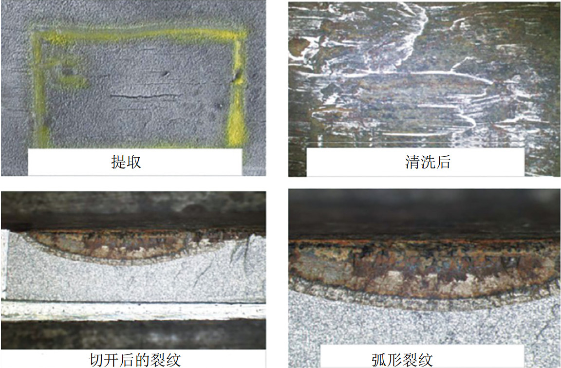 破裂區外表面,磁粉檢測顯示存在與已識別的機械損傷相關(guān)的裂紋(圖 6),該機械損傷促使管道發(fā)生了應變硬化,并導致管道母材上與非平坦區域的連接處形成了機械應力。