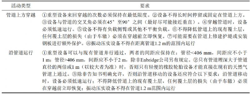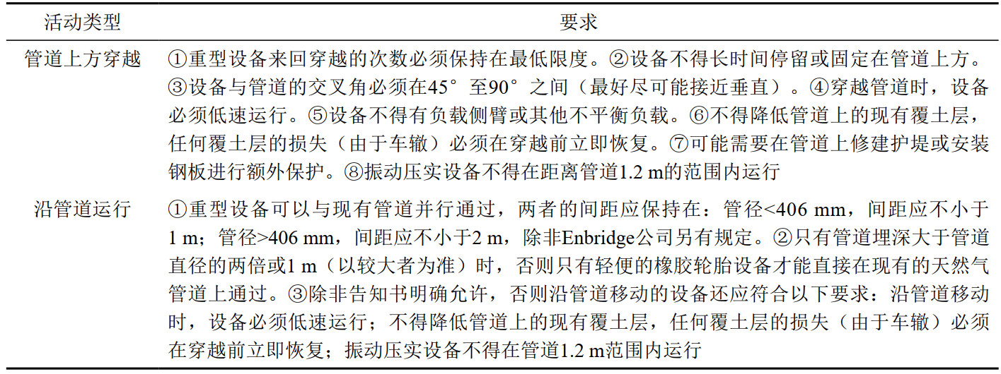 2016年加拿大能源局(NEB)發(fā)布《農用車(chē)輛或移動(dòng)設備穿越管道安全指南》,要求若車(chē)輛或移動(dòng)設備的負載軸重和輪胎壓力超出管道企業(yè)規定的限值和操作指南范圍,則應提前通知管道企業(yè)協(xié)商制定通過(guò)方案。Enbridge公司要求當重型設備在管道上方活動(dòng)時(shí),應符合表 2要求并根據實(shí)際制定防護措施,由管道企業(yè)與第三方施工單位共同制定保護方案。