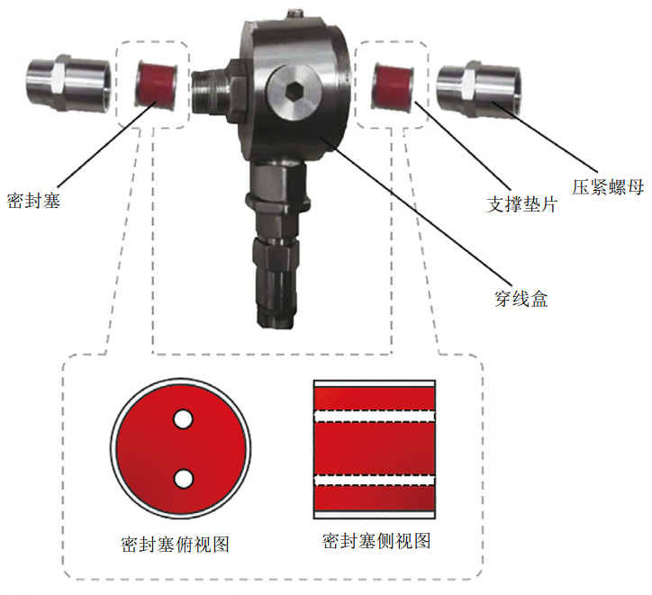 (1)增設密封塞支撐片。為了防止因壓緊螺母緊固過(guò)度,導致密封塞破損,在密封塞底部加裝帶有孔洞的不銹鋼圓形支撐片,厚度為1.5 mm,直徑等于穿線(xiàn)孔底部凸臺外徑,在密封塞頂部同樣加裝同規格的支撐片,避免壓緊螺母直接作用在密封塞上,使得壓緊螺母的壓力先作用在支撐片上,再由支撐片均勻作用于密封塞,使其與線(xiàn)纜擠壓受力均勻,達到良好的密封效果。