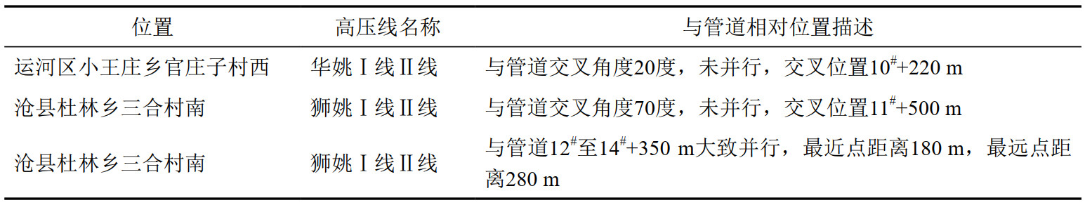 現場(chǎng)踏勘11#和12#附近發(fā)現3條22 kV高壓輸電線(xiàn)路,與管道相對位置見(jiàn)表 1。距管道1.6 km處為滄州華潤發(fā)電廠(chǎng),與管道相對位置見(jiàn)圖 1。