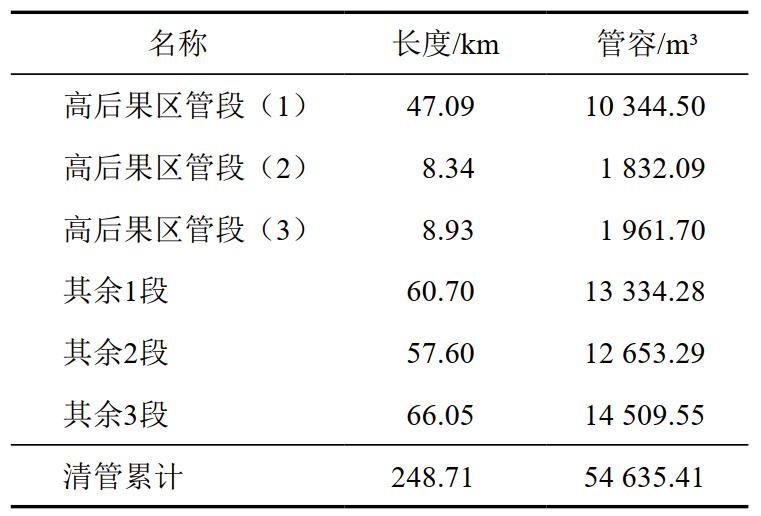 表 1 各區段清管長(cháng)度及管容