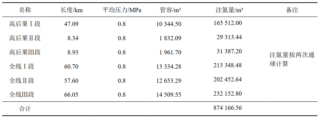 氣體作為置換介質(zhì)與液體介質(zhì)在技術(shù)要求上存在不同。由于氣體的可壓縮性能強于液體,導致用氣量和推掃壓力很難穩定控制,且停運管道的承壓能力相對降低,在編制方案時(shí)要充分計算在內,并預估用氮氣量和推掃壓力的安全允許區間。