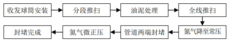分段推球吹掃完成后,開(kāi)始對管道內混合空氣進(jìn)行氮氣置換。之后對管道進(jìn)行泄壓放空,將氮氣壓力降至常壓,隨后封堵管道兩端,用制氮車(chē)對管道升壓至微正壓,完成封存。具體流程如圖 3。