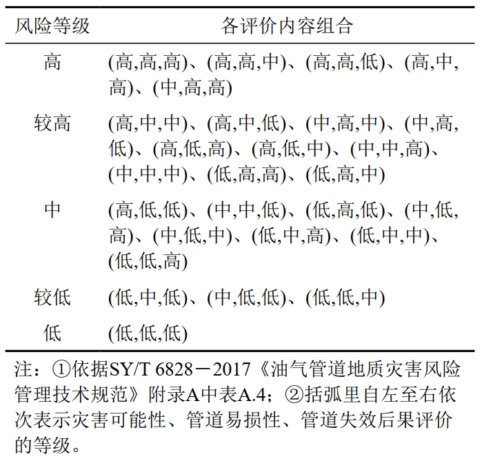 在風(fēng)險識別調查結果的基礎上,進(jìn)一步對橫坡敷設段演化為災害的可能性、管道易損性以及管道失效后果進(jìn)行定性分級,見(jiàn)表 1、表 2、表 3。并根據SY/T 6828―2017《油氣管道地質(zhì)災害風(fēng)險管理技術(shù)規范》,將山區管道橫坡敷設段劃定為五個(gè)風(fēng)險等級,見(jiàn)表 4。