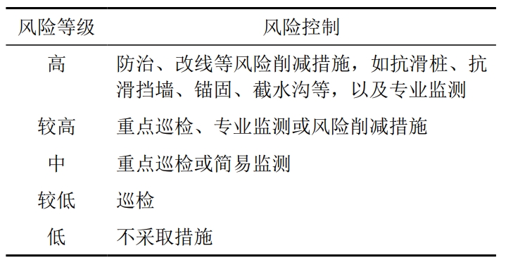 根據不同風(fēng)險等級采取對應的技術(shù)控制措施,見(jiàn)表 5。當災害點(diǎn)風(fēng)險較高時(shí),需開(kāi)展工程治理。其中滑坡和不穩定斜坡治理方法包括截排水溝、錨固、抗滑樁、擋土墻和削方減載壓腳等;坡面水毀治理方法包括截排水溝、擋墻、截水墻等。