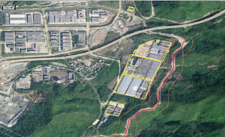 圖 1左上角為比例尺。黃色區域為人口分布區,紅色為管線(xiàn)走向,藍色為3×10-5個(gè)人風(fēng)險等值線(xiàn),粉色為1×10-5個(gè)人風(fēng)險等值線(xiàn),橙色為3×10-6個(gè)人風(fēng)險等值線(xiàn)。