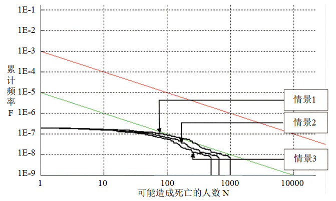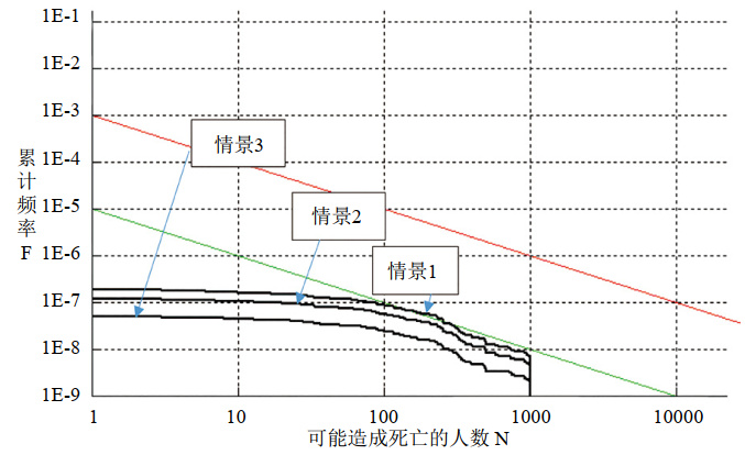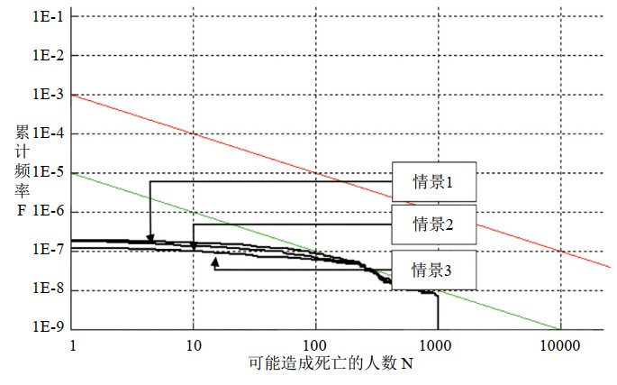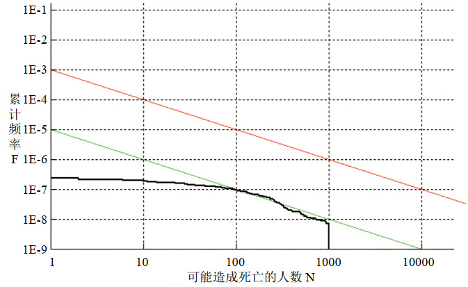 圖 2中紅線(xiàn)與綠線(xiàn)之間的區域表示可能造成死亡人數小于1000的區域為風(fēng)險可接受區。紅線(xiàn)之上以及可能造成死亡人數大于1000的區域為不可接受區。綠線(xiàn)之下以及可能造成死亡的人數小于1000的區域為風(fēng)險可接受區。